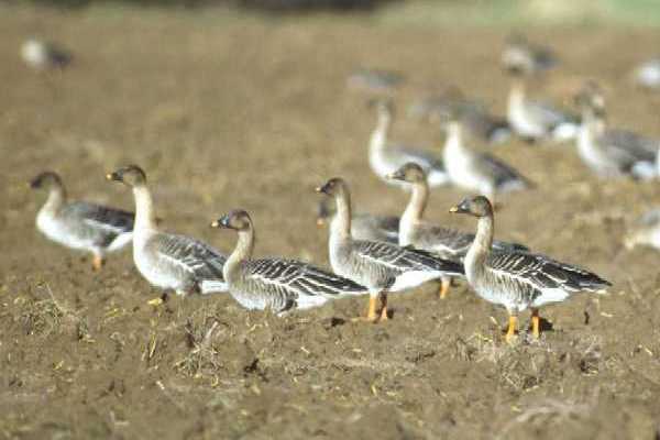 Kennzeichen: Wesentlich kleiner als die Graugans. Zudem ist die Färbung ihres Gefieders grau-braun, an Hals und Kopf sogar dunkelbraun. Der Schnabel ist schwarz mit einer gelb-orangen Binde., wobei letztere je nach Unterart-Zugehörigkeit in der Breite stark variieren kann. Am Unteren Niederrhein kommen zwei geographische Unterarten zur Beobachtung, die Tundra-Saatgans und die Waldsaatgans.