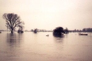 die einzige Siedlung vor den Deichen, die vereinzelten auf Warften gelegenen Höfe oder die Baumreihen und Feldgehölze ragen dann noch aus der gewaltigen Wasserfläche heraus.